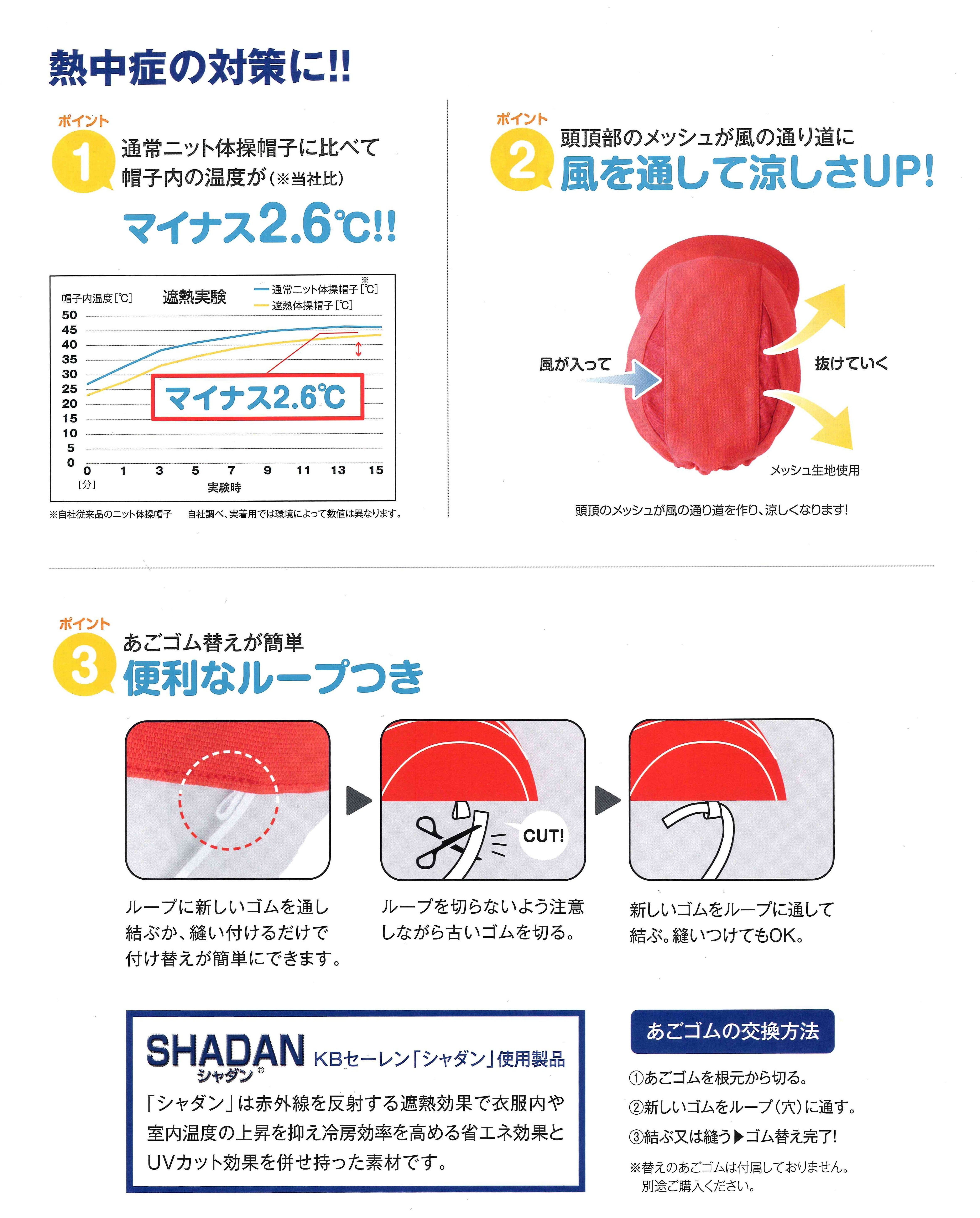 ポイント①通常ニット赤白帽子に比べて、帽子内温度がマイナス2.6℃!快適さを実感できます。